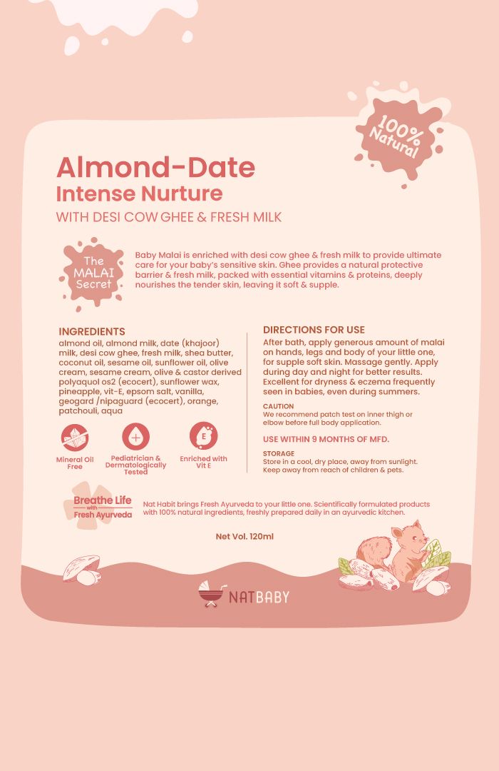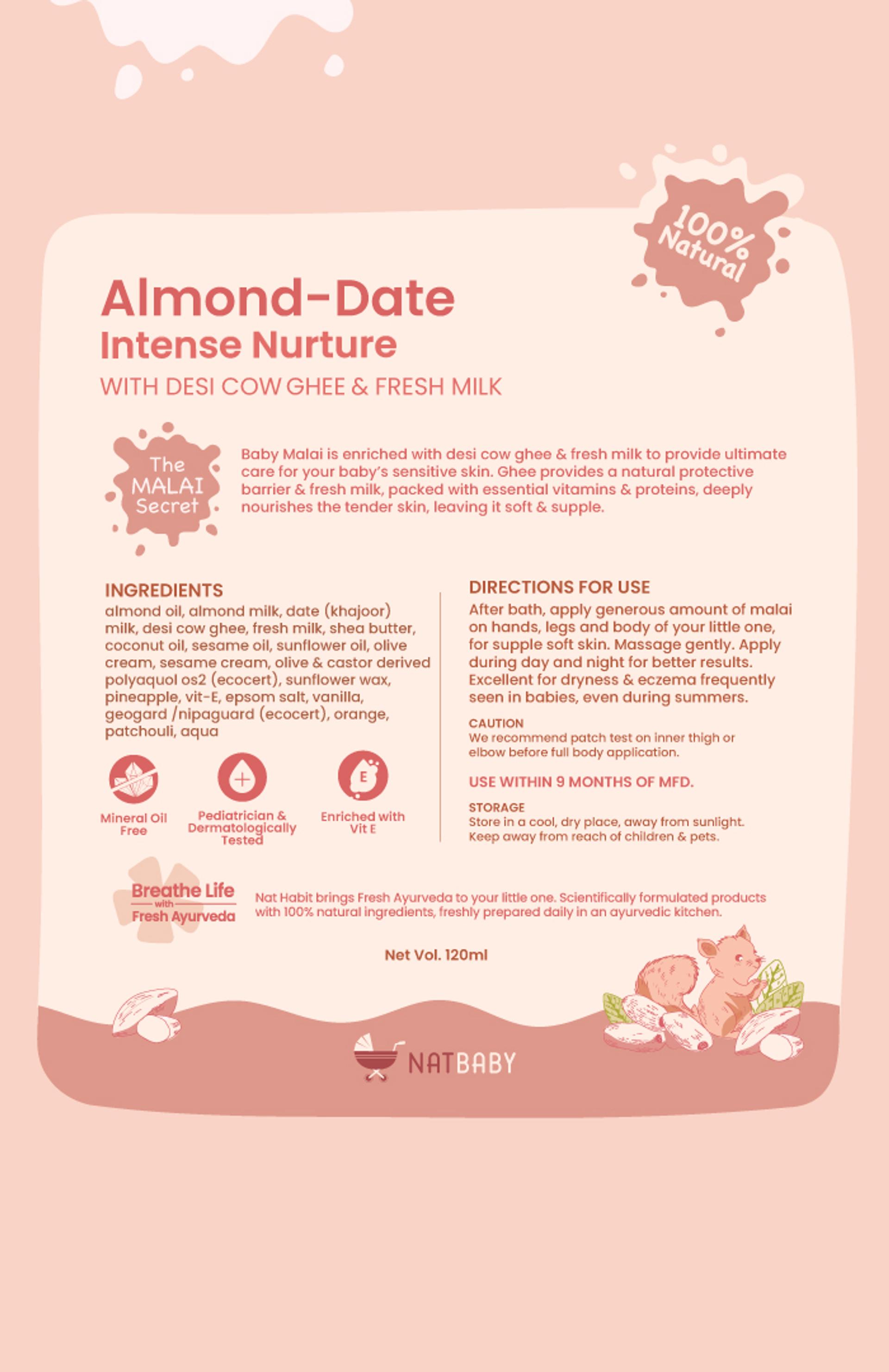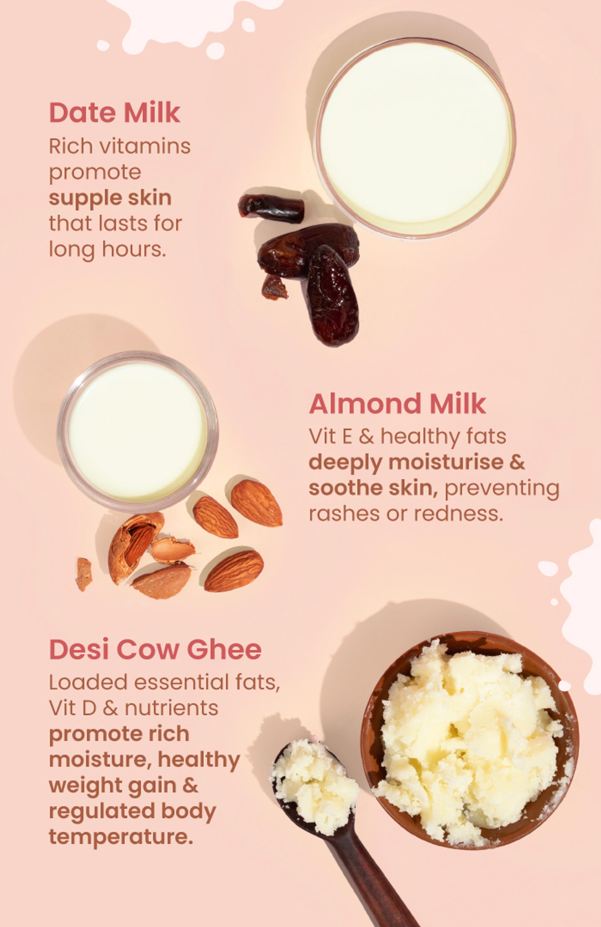 MALAI infuses baby skin with almond and date milk vitamins, minerals, amino acids, and soothing nutrients that strengthen the developing skin barrier. These nutrient-dense milks support healthy cell growth, improve moisture retention, and keep delicate skin velvety soft, calm, and naturally radiant.