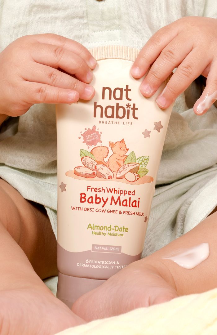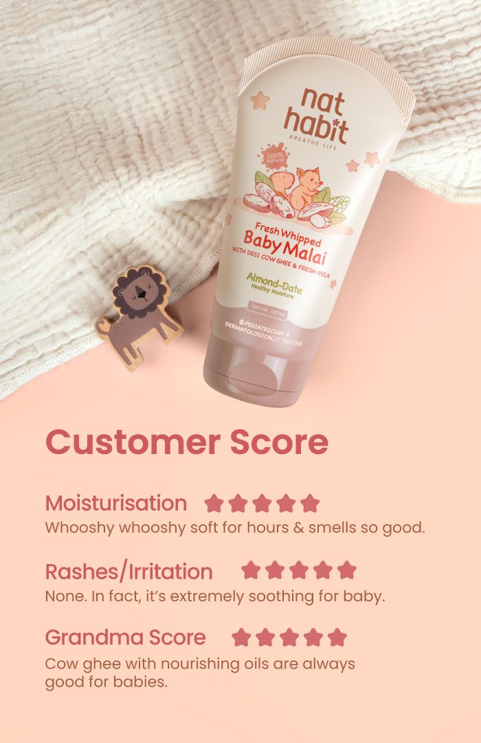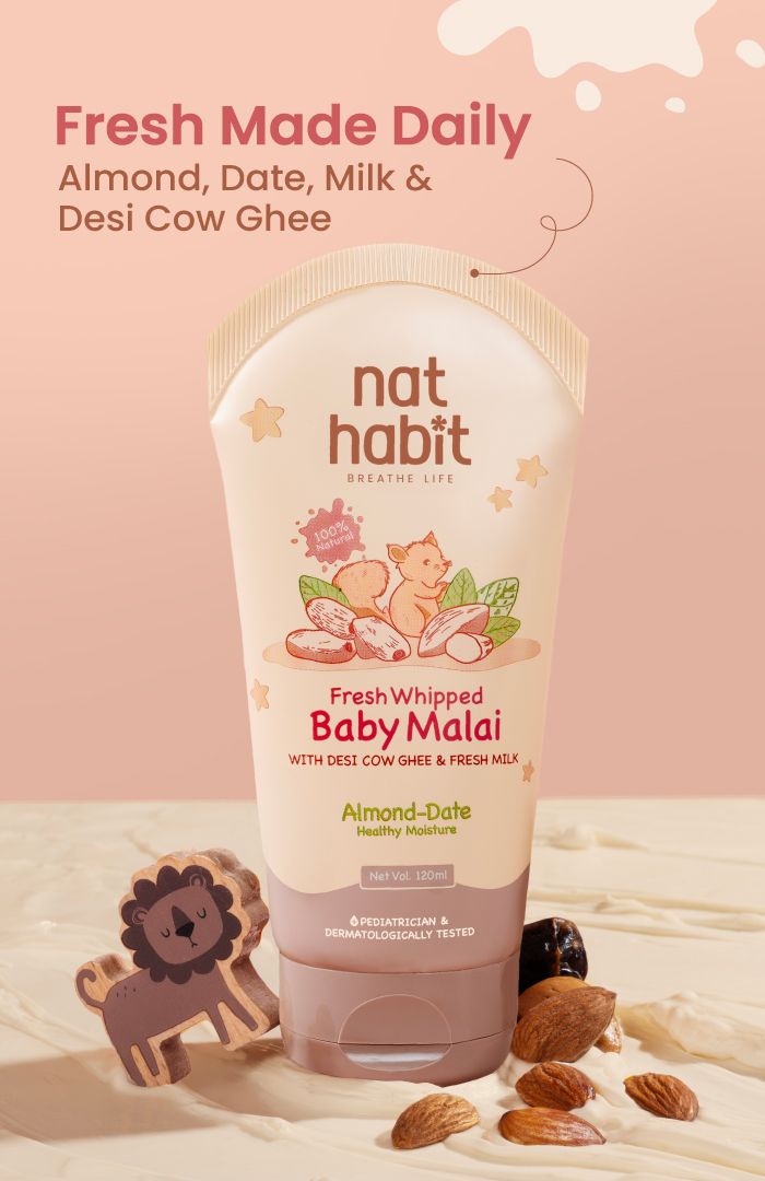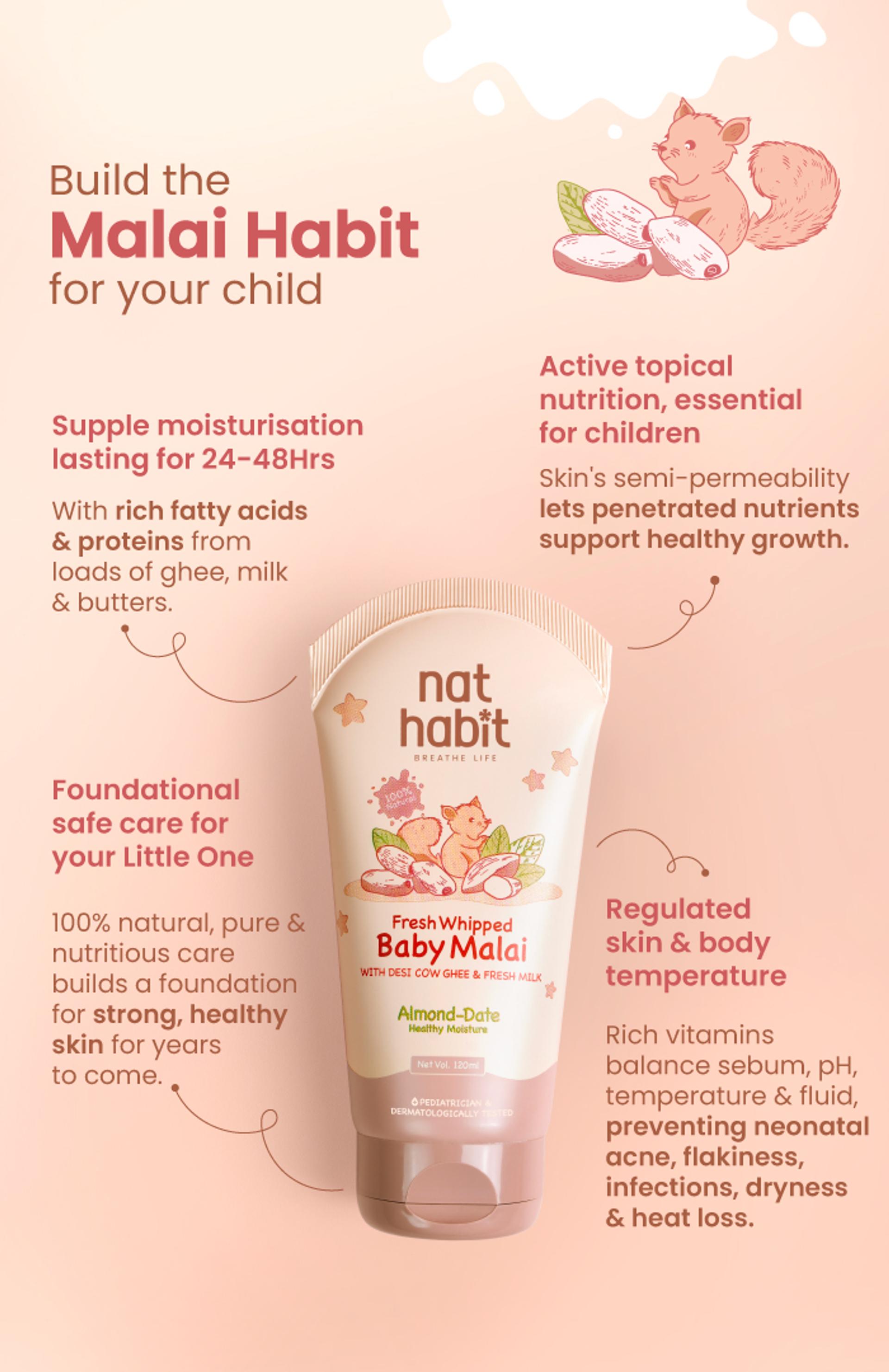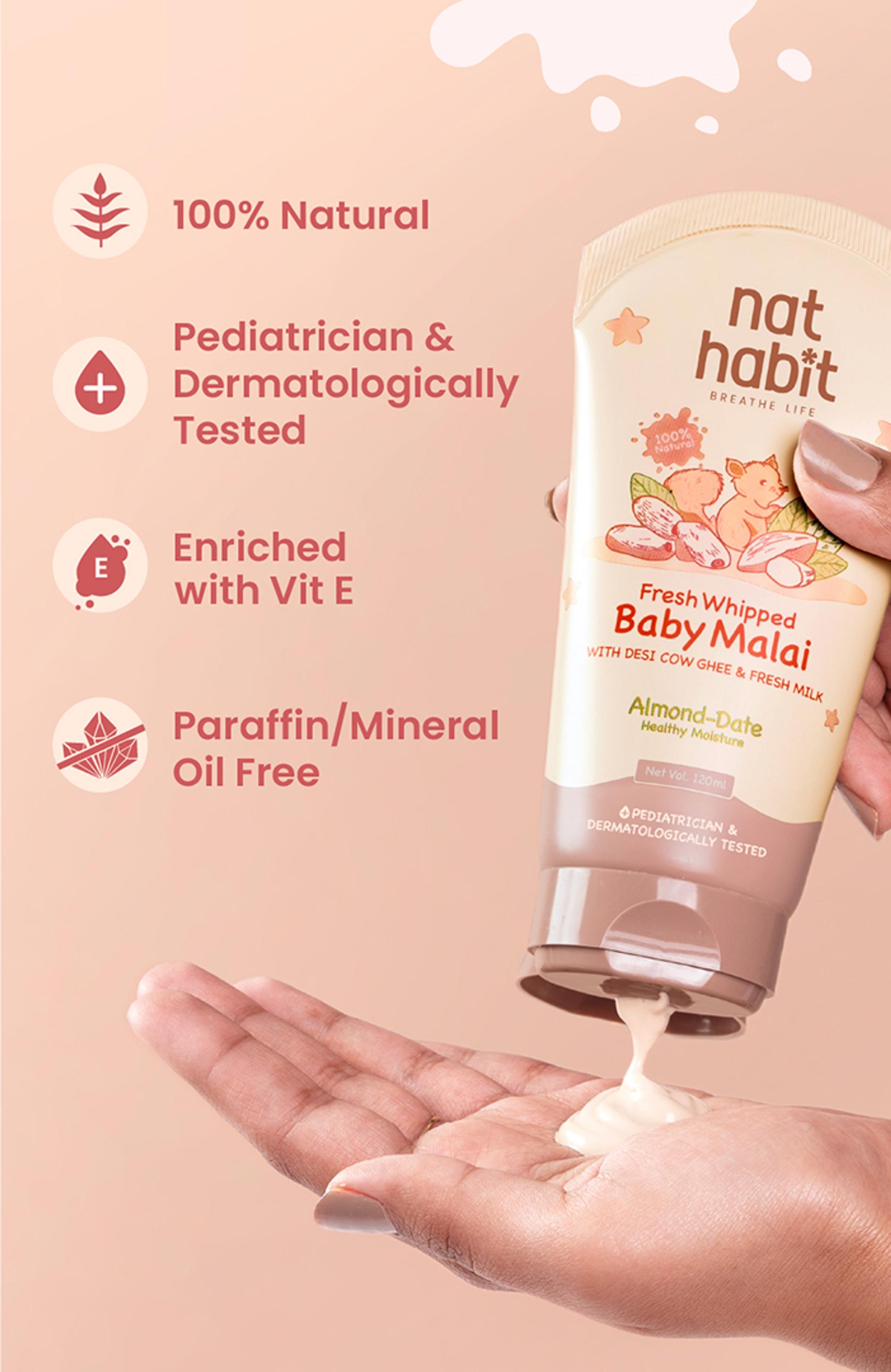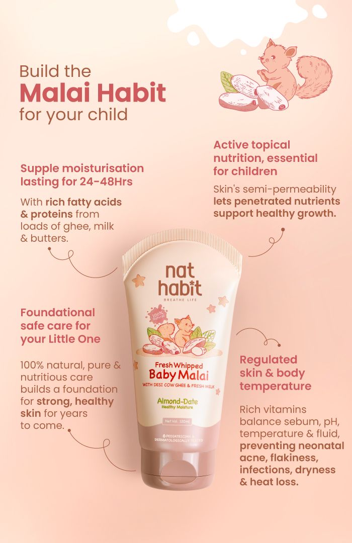 Baby’s semi-permeable skin absorbs the richness of Malai’s active vitamins, fats, proteins, & nutrients. It delivers deep moisture, removes flakes, protects the skin, helps regulate their body temperature, leaving MALAI-soft, supple skin with loads of giggles. MALAI care - 100% Natural. 0% Chemicals. Paediatrician & Dermatologically Tested.
